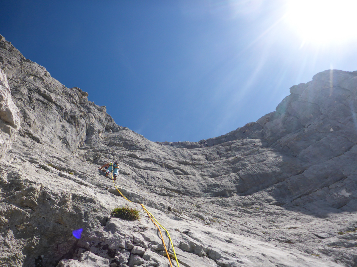 Der Weg unter die Guffert Südwand ist leicht zu finden. Um die Da Capo zu finden muss man schon ein bissl hinschaun. Der ausgeprägte Kamin war für uns der Schlüssel, eine Gufel – wie im Topo verzeichnet – habe ich nicht gesehen. Aber gut. Gufel, Nische oder Verschneidung….: Gesucht, gefunden, ne Menge Spass gehabt und allerschönste Züge gezogen (…sagt man das so?!)