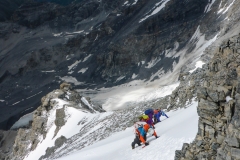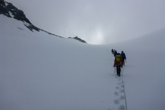 Die eigentlich geplante Thurwieserspitze lassen wir nach Begutachtung des Bruchs am Ortlerjoch schnell gut sein. Also Plan B: Monte Zebru. Zwar verhauen wir uns im Nebel weil wir den vorhandenen Spuren zu lange folgen, letztlich finden wir dann doch nach oben. Was soll ich sagen…schöne Tour aber letzlich ist das Gebiet recht brüchig. Das machts für grössere Gruppen problematisch. Aber: Das Refugio Quinto Alpini ist eine Schau! Bestes Essen, nette Leute. Dieses ist einen Besuch wert!