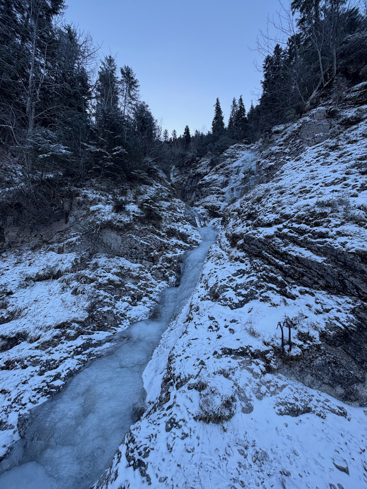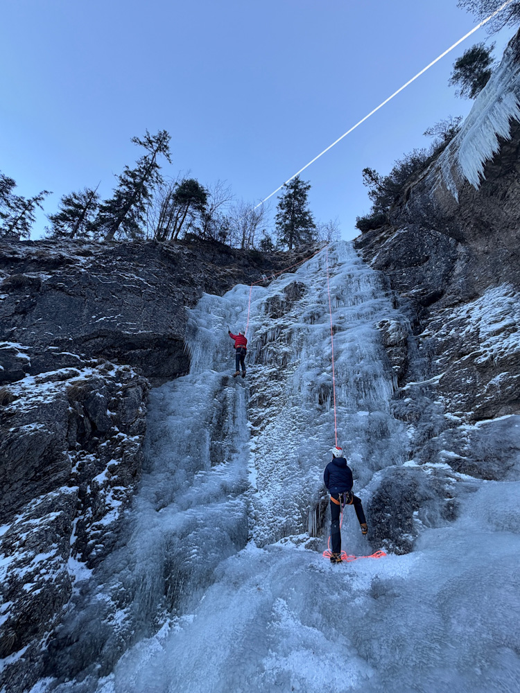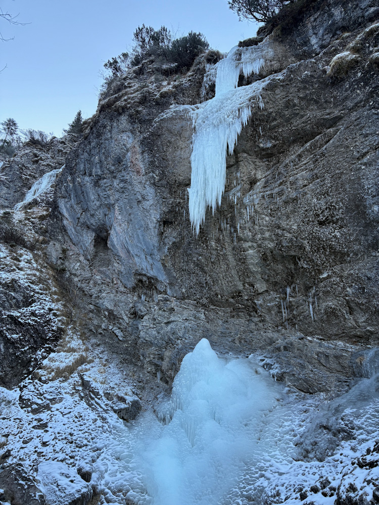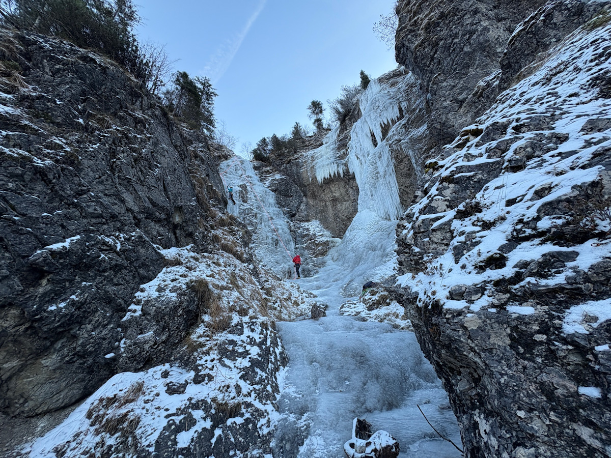 Wir waren nur im unteren Kessel, es gingen aber auch Spuren nach oben. Unten noch verhältnismäßig wenig Eis, nur die hinteren Routen sind derzeit kletterbar. Ich vermute aber das es noch aufbaut denn es fließt durchaus Wasser. Für den Moment recht guter Spass:)
