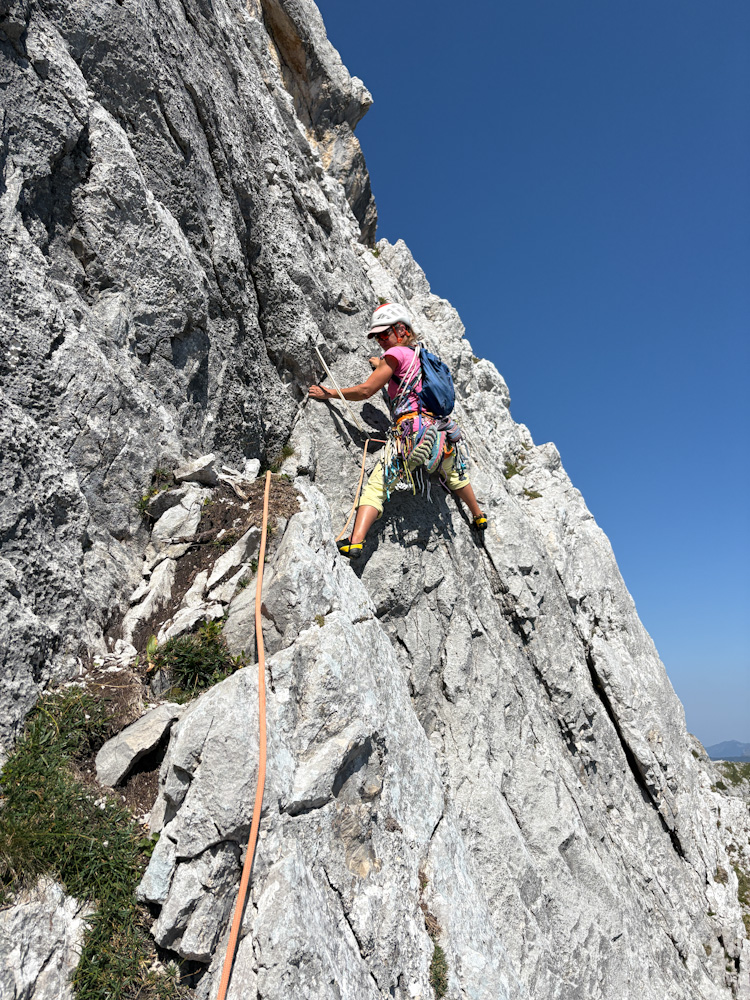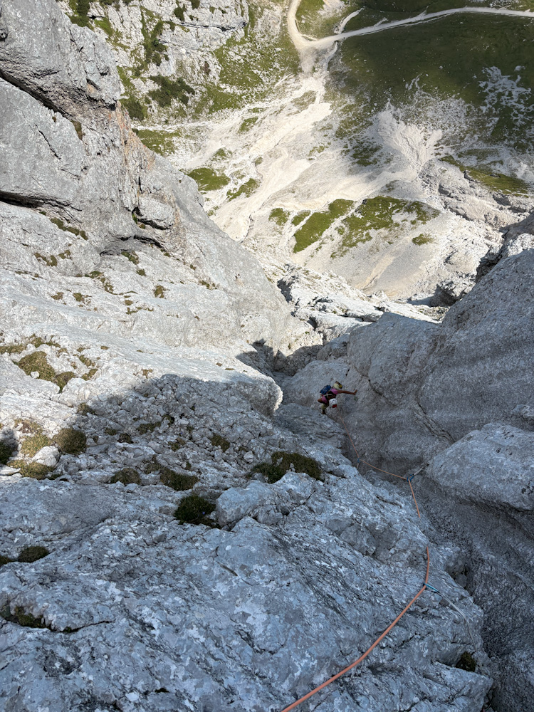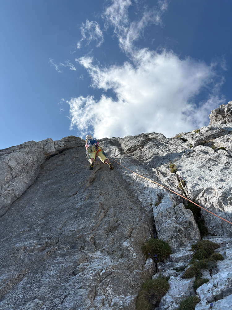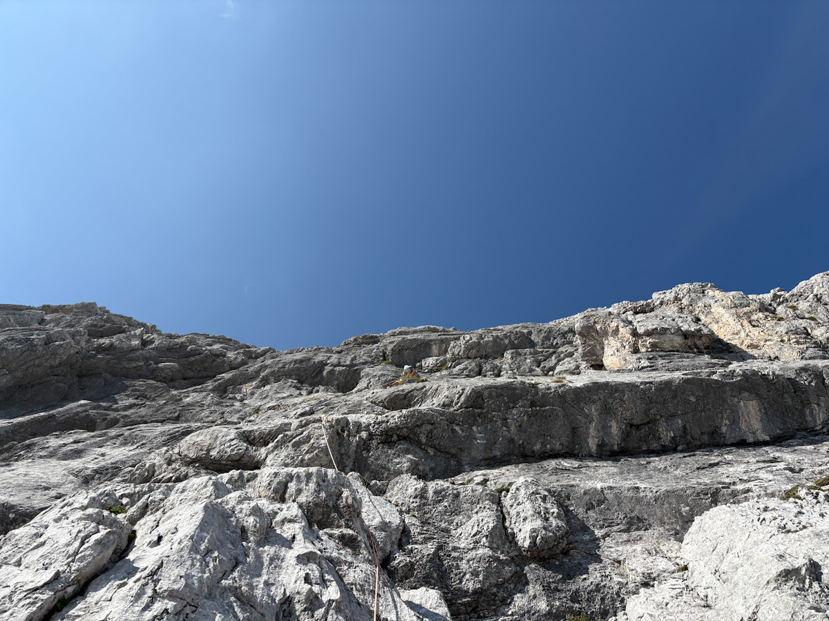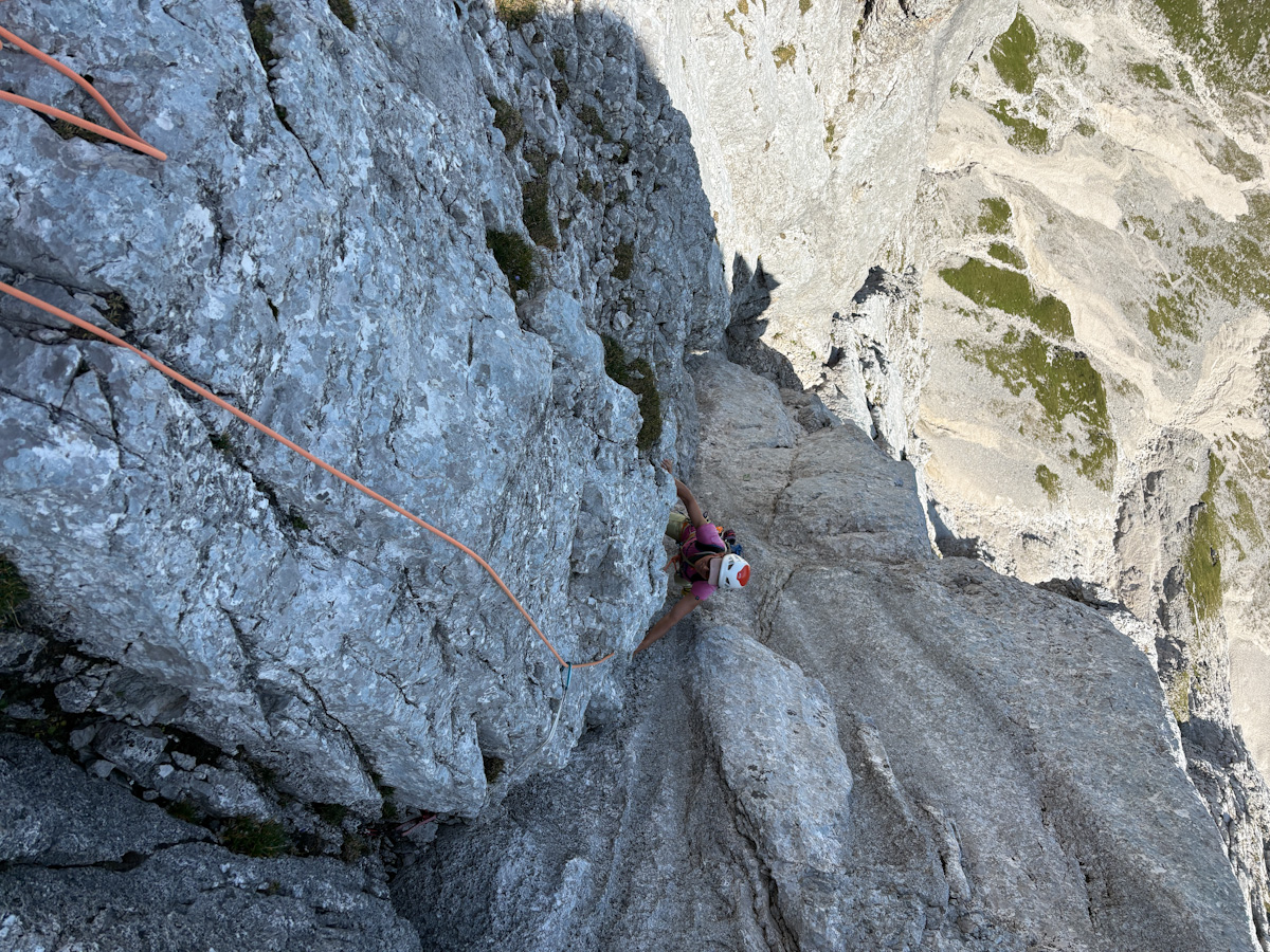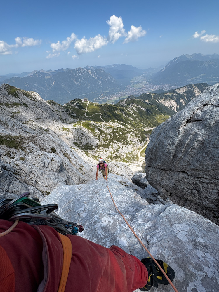 Sehr schöne homogene Kletterei, wirklich empfehlenswerte Route. Der Name ist in gelb angeschrieben, danach ist die Wegfindung nicht immer ganz trivial. Das im Panico Wetterstein Nord (2004) gedruckte Topo ist eher richtungs- als wegweisend, auch die Anzahl der Zwischensicherungen stimmt selten. Thema Zwischensicherungen: wenn man nicht weit über einem 5er steht sind Cams 0.4-2 durchaus ratsam.