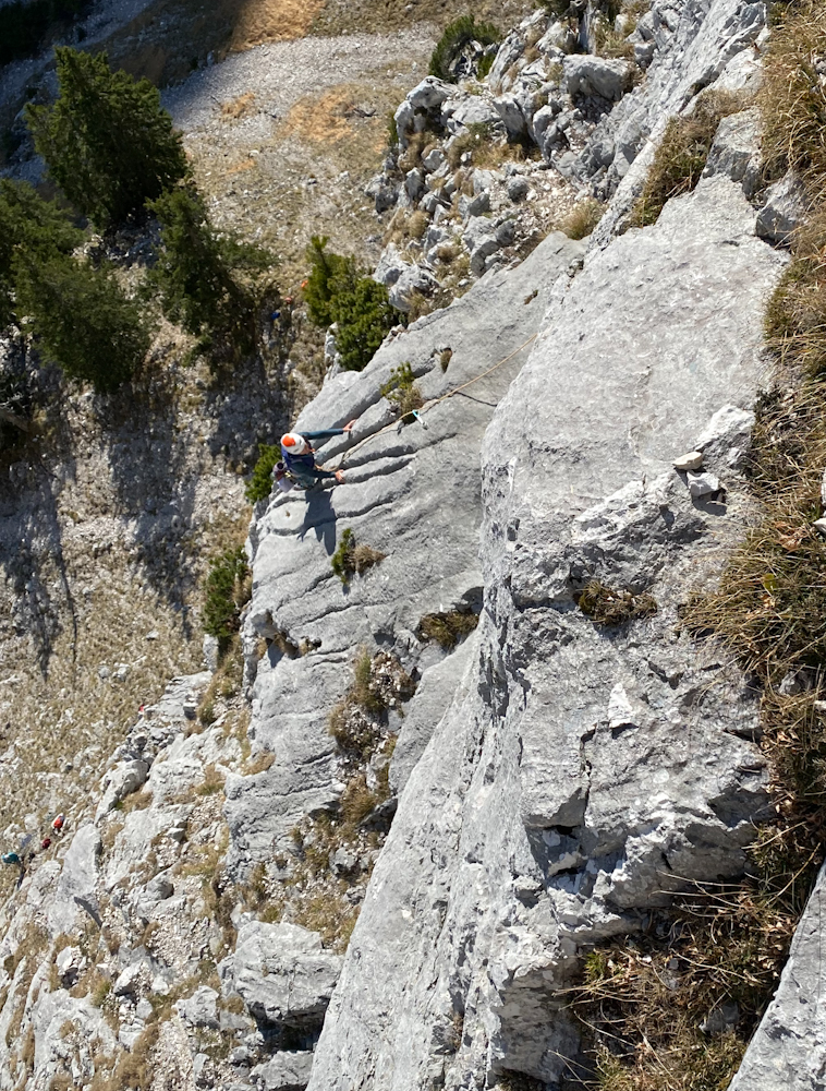 Abstieg: Vom Gipfel nicht ganz unheikel (brüchig) nach SW bis ein Gendarm den Weg versperrt. Dort gibt es Bolts, 5m runter und dann waagrecht nach W, ca 20m, 3 Bolts zur Abseilstelle. Kann man gut am gleitenden Seil machen, vor allem wenns Nass ist eine gute Idee. Im Topo ist 2X25m angegeben, das stimmt so nicht. Eher 18m und 30m. Mit nem 50er Einfachseil muss man abklettern.