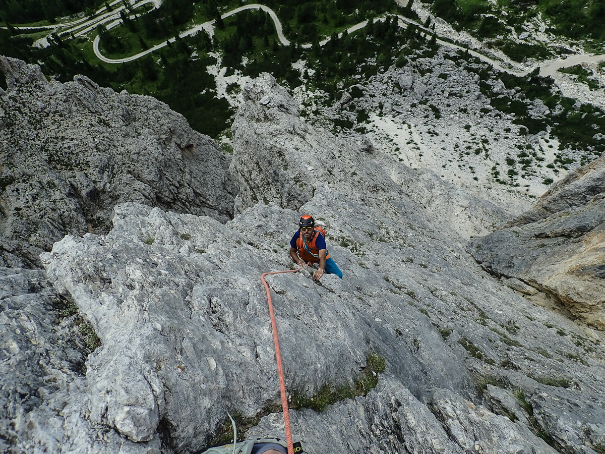 Zum leichten anstarten gehen wir die Alpini Kante and der Pyramide Col del Bos. Überwiegend zementierte Standplätze, ab und an ein Zwischenhaken. In den leichten Seillängen bringt man kaum etwas unter und kommt so auf durchaus weite runouts, dafür ists halt aber auch leicht. Sehr logische Routenführung und das Bergsteigen.com Topo stimmt auch: Plaisiertag:)