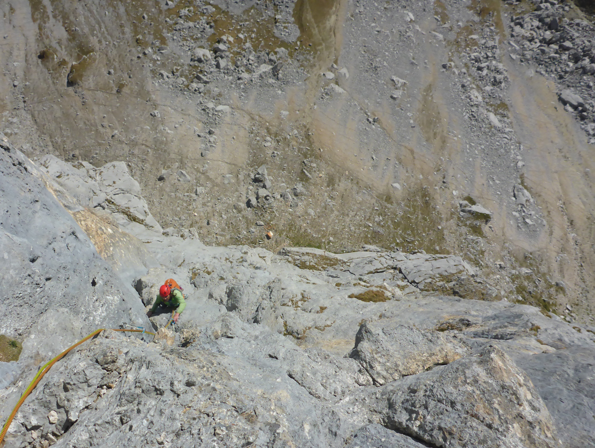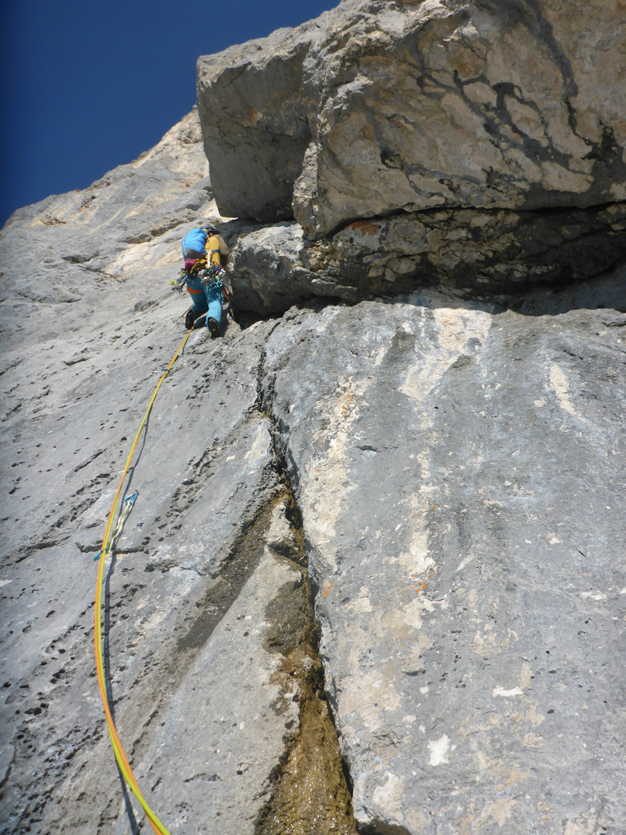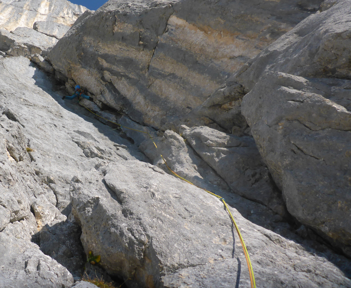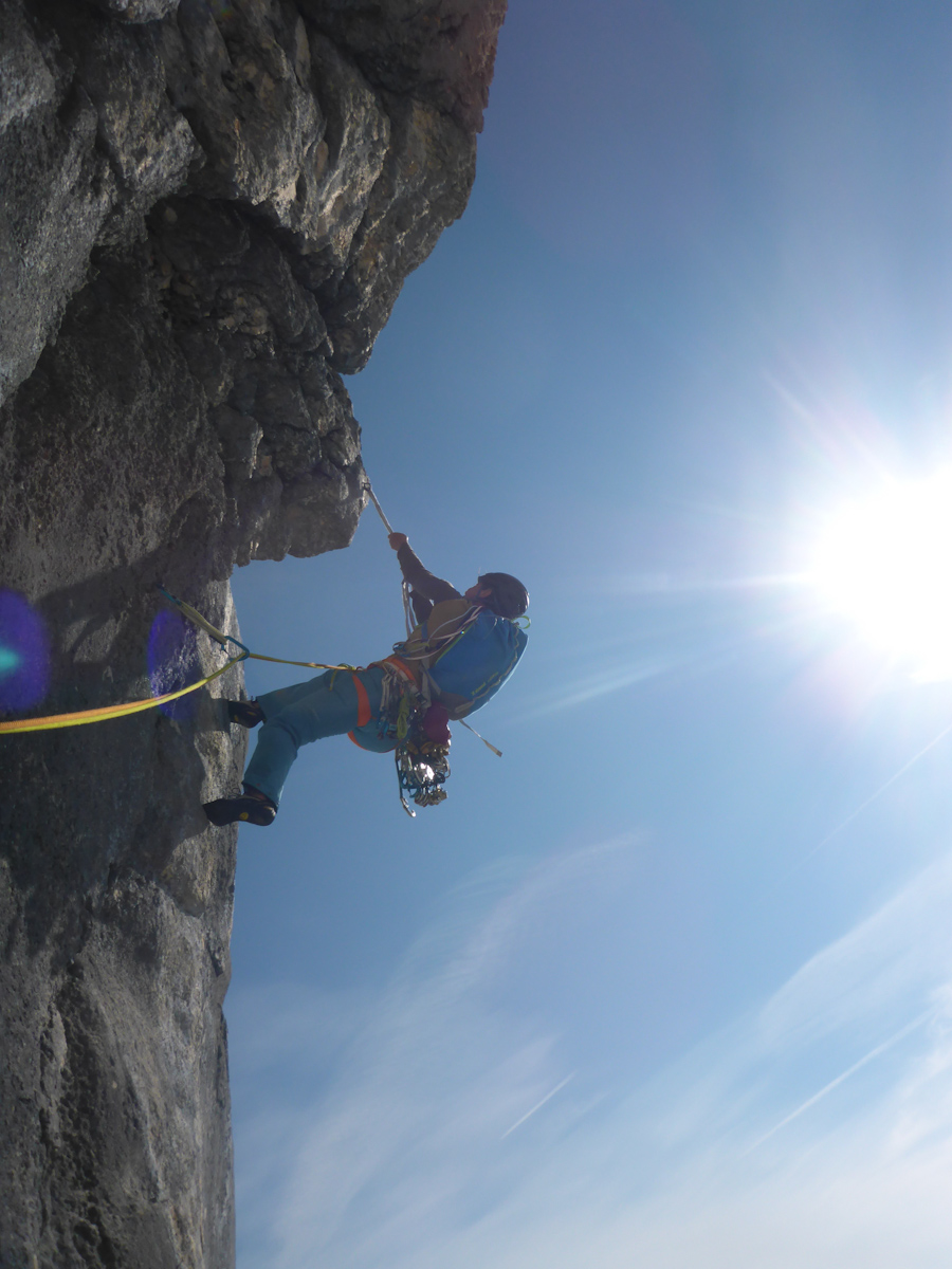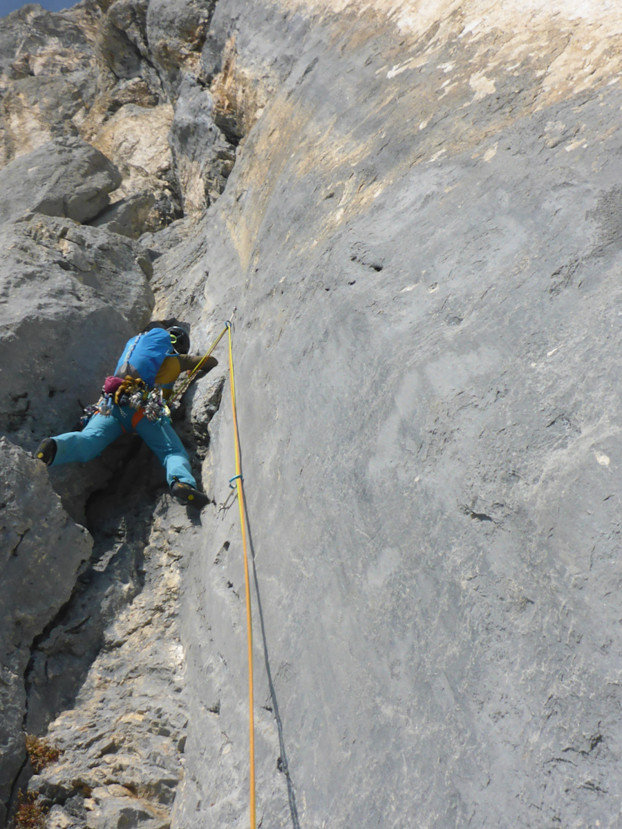 Ach ja: Durchwegs geboltet, das geht aus den Topos nicht so recht hervor. Alles sind Verbundanker, an den Ständen sogar zwei davon, dazwischen schon ordentliche Abstände. Wir waren froh über einen Satz Cams 0.3 bis 2 zusätzlich, vor allem für die Risse. 10, 12 Exen kann man schon mitnehmen. Die Pfeilerrisse und der Rest der Route sind im Topoguide korrekt beschrieben…das Panico Topo stimmt hint und vorn nicht. Zak Abseilpiste wie im Topoguide beschrieben besser vergessen wegen Seilverhängern, wenn abseilen dann über Knapp-Köchler, ansonsten Schnellabstieg.