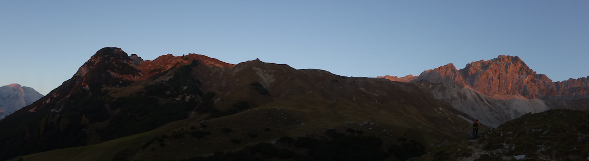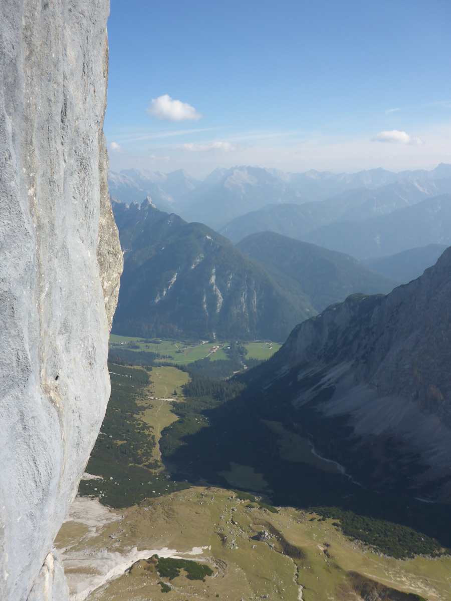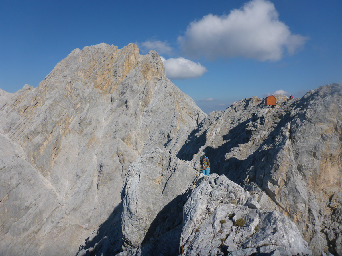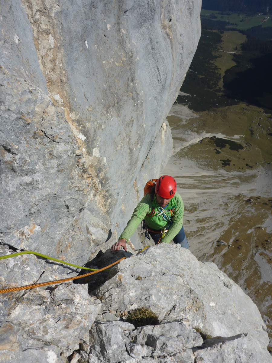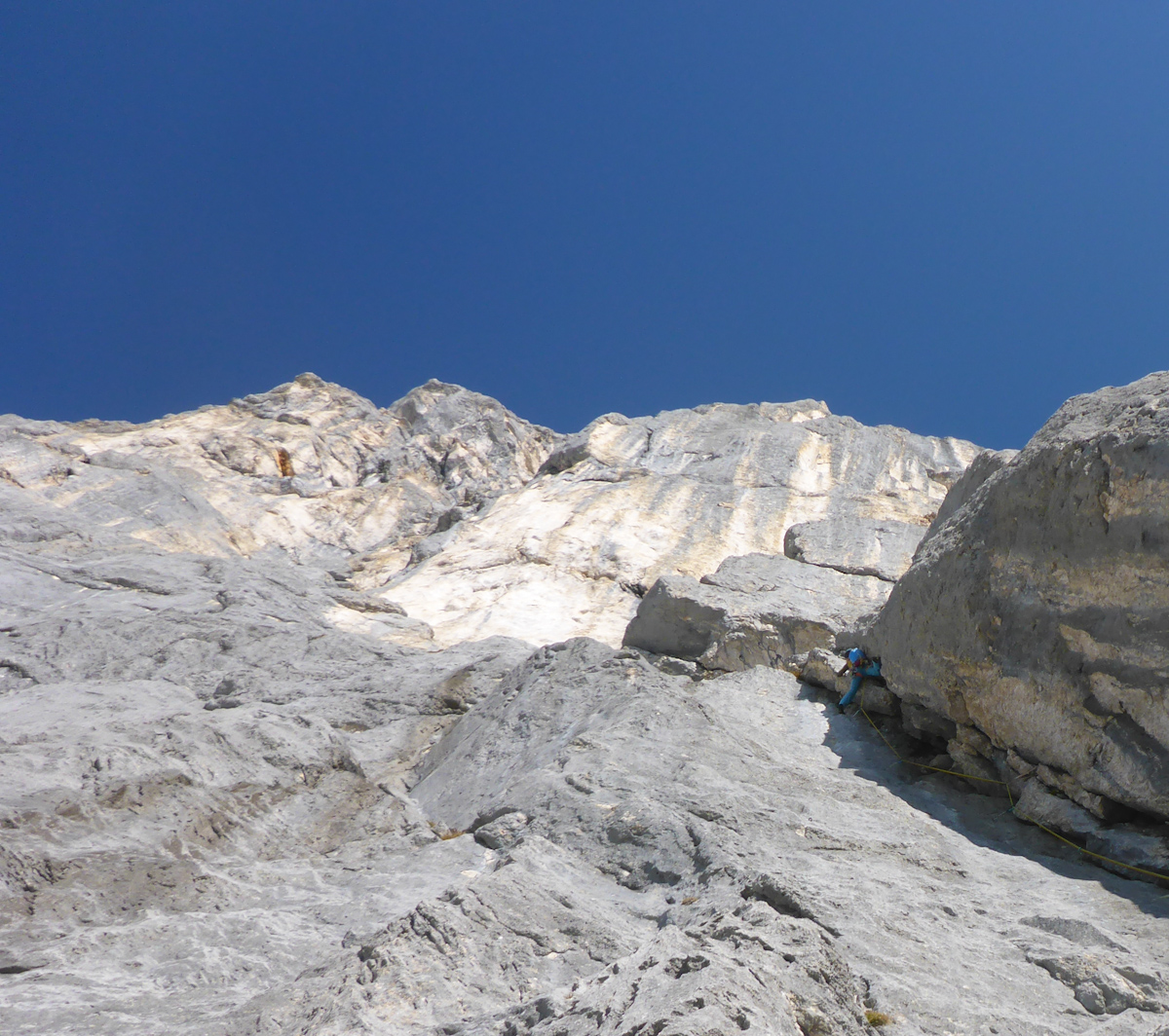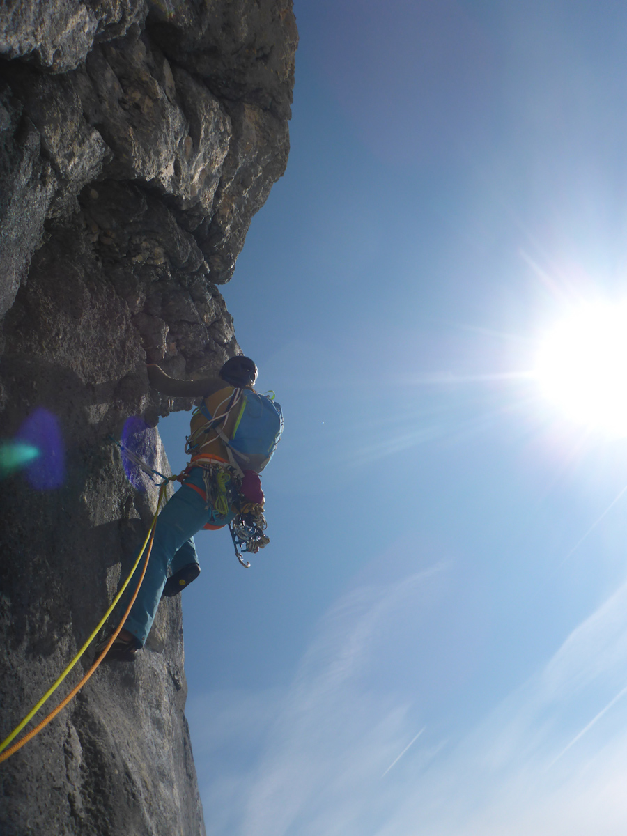 Ach ja: Durchwegs geboltet, das geht aus den Topos nicht so recht hervor. Alles sind Verbundanker, an den Ständen sogar zwei davon, dazwischen schon ordentliche Abstände. Wir waren froh über einen Satz Cams 0.3 bis 2 zusätzlich, vor allem für die Risse. 10, 12 Exen kann man schon mitnehmen. Die Pfeilerrisse und der Rest der Route sind im Topoguide korrekt beschrieben…das Panico Topo stimmt hint und vorn nicht. Zak Abseilpiste wie im Topoguide beschrieben besser vergessen wegen Seilverhängern, wenn abseilen dann über Knapp-Köchler, ansonsten Schnellabstieg.