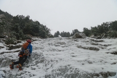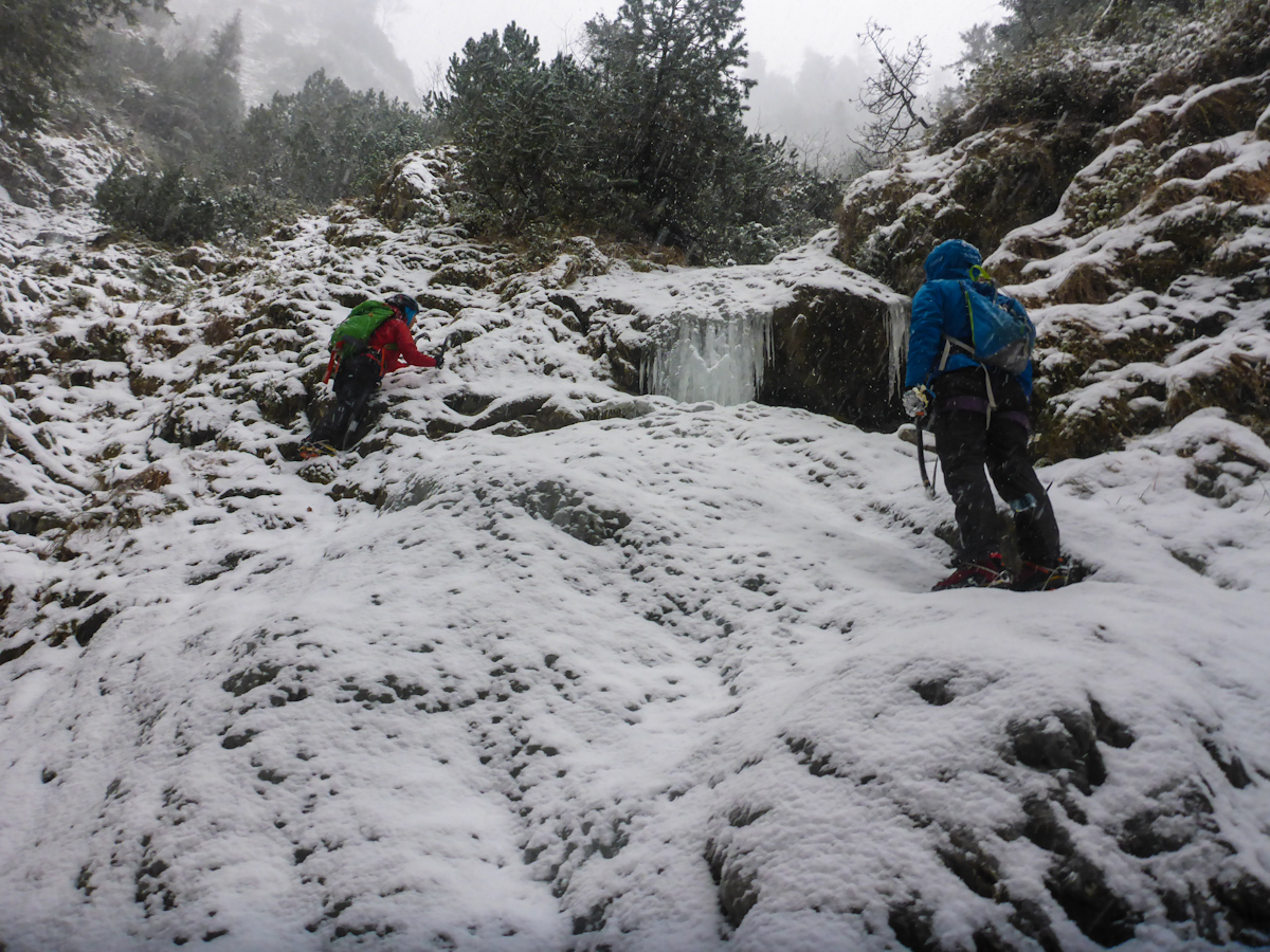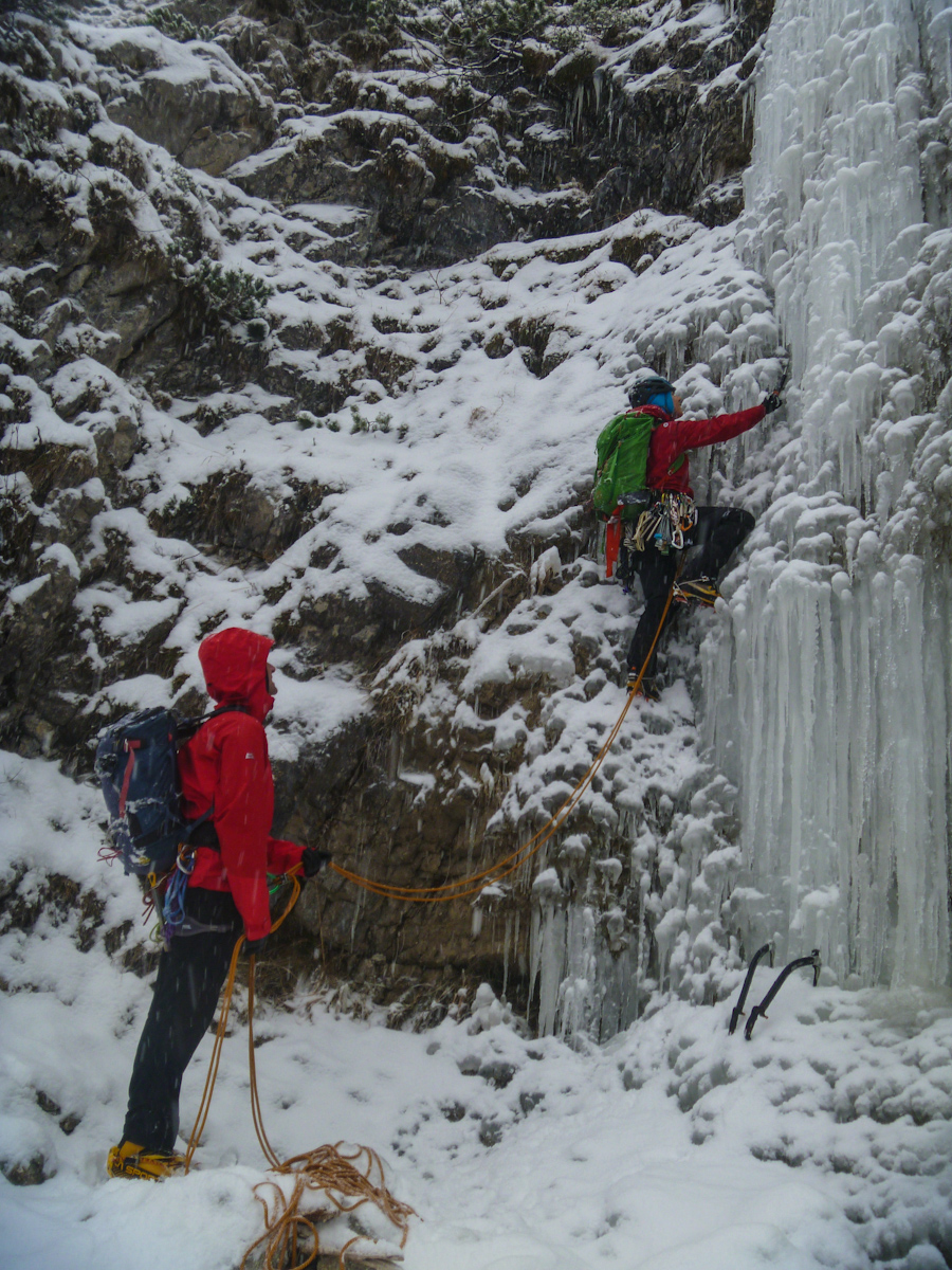 Nachdem es doch ein paar Tage anständig kalt war und der Gartenteich zugefroren ist dachten wir dass das auch für den Jochberg gelten könnte. Nun ja: das rechte Gully (Panicoführer, 2. Aufl.) hat am Einstieg gar kein Eis. Von der Strasse sieht man aber einen schon ganz ordentlich aufgebauten Eisschild im ganz rechten Gully (nicht im Panico beschrieben) also mal dorthin…