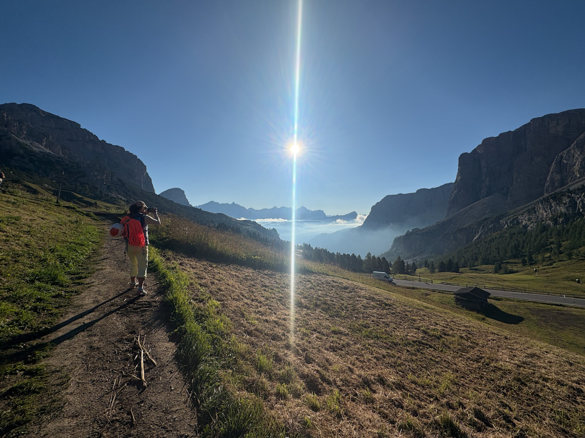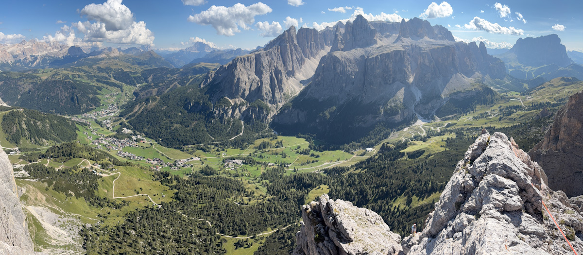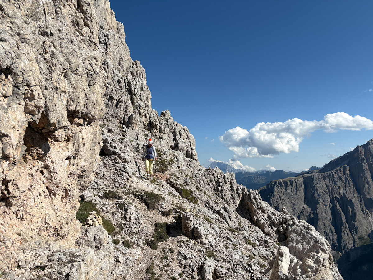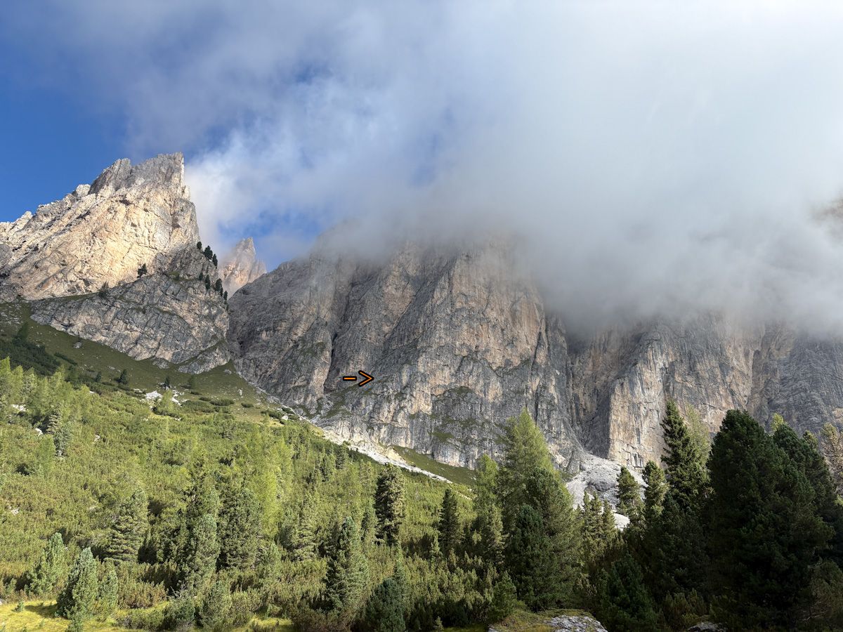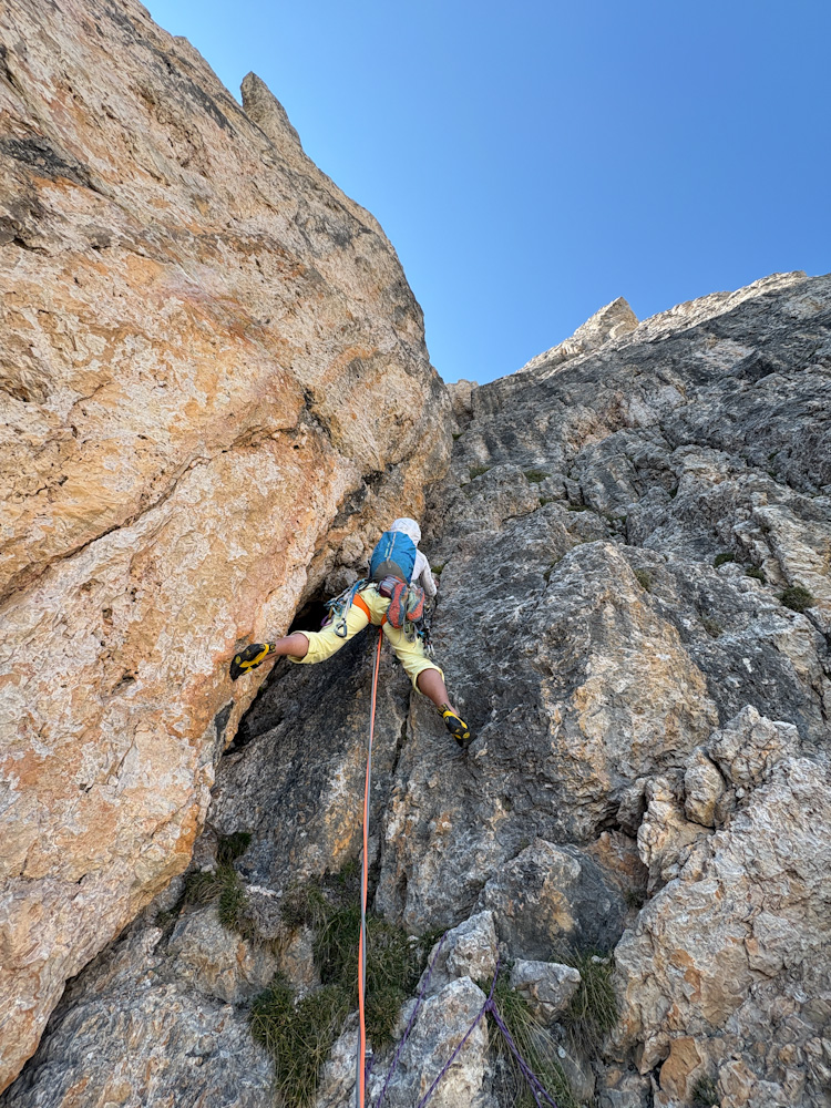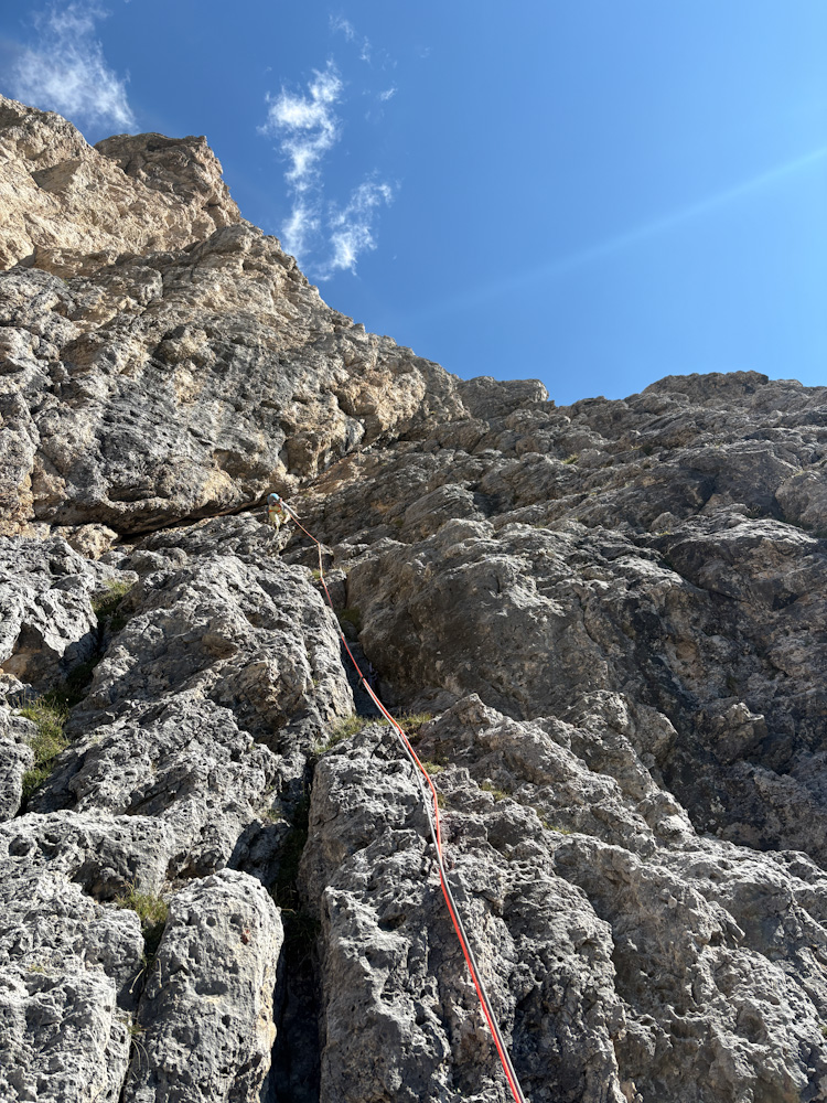 Die Rampenführe an der Südwestwand des Sas Ciampac erscheint im Führer wegen der moderaten Kletterschwierigkeiten als nicht allzu ernstes Unterfangen. Klettern ist hier das Eine, den Weg finden das andere:) Besonders in der zweiten Hälfte wirds recht knifflig zumal ab der 6. Seillänge praktisch keine Zwischensicherungen mehr vorhanden sind die gelegentlich den Weg weisen. Auch die Stände sind hier nicht mehr mit Schlingen versehen. Das Topo von Mauro Bernardi ist sehr genau…man muss ihm halt auch genau hinterherlaufen sonst produziert es arge Verhauer die ordentlich Zeit und Nerven kosten. Den Riss in der 9. Seillänge haben wir unbeabsichtigt mit einem nun fixen Keil markiert 🙂